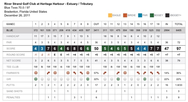 It didn’t go well. Maybe I put too much pressure on myself to play well because Andrea was out there or because I had just shot the greatest round of my life two days earlier. I was tense and I let myself get frustrated early and easily. My driver wasn’t working and my irons weren’t either. I went from having complete confidence in my driver and a confidence that I could hit more greens with my irons to not believing I could hit anything. But Andrea turned me back to being positive and the back nine was better. It doesn’t look better on the card, it it was.