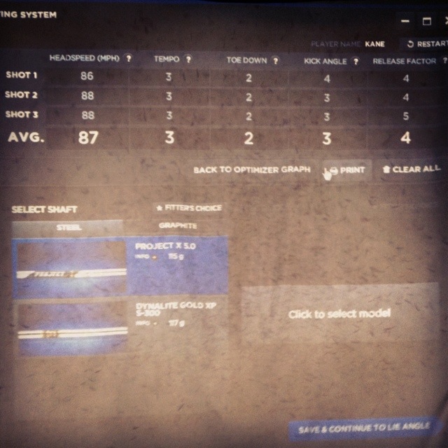 The Shaft Optimizer is a special club, with accelerometers, microprocessors and strain gauges built in, that measures how you load and unload the club. After only 3 swings, it will tell you your clubhead speed (with a 6i) kick angle, toe down, release factor and then suggest the right shaft for your swing.