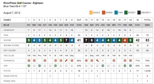 I had a chance to play RiverPines after work for my first match in the Atlanta Golf League. This is the second time I’ve played RiverPines and this 83 is the best round I’ve ever posted. The course is still in excellent shale. I felt completely in control of this round the entire time. I was focused, I hit great shots with the irons, driver, rolled some putts and recovered well. I wanted to go out and hit the same shots I’ve hit on the range, but actually do it on the course for a change. I did.