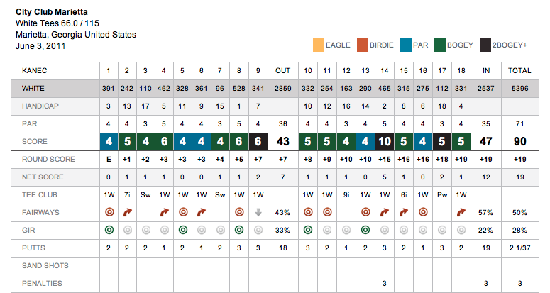 What happened? Hard to say. Expectations too high, maybe. Tired? Probably. But I was not driving the ball well or striking irons well. My nice controlled fade from yesterday was replaced with a slice. My nice iron play replaced by good contact but really low ball flight with a more aggressive fade. I got frustrated quickly and that didn’t help. It’s all about consistency. I need to play more and I need to practice more if I’m going to score well. My putting was OK, I’m starting to feel more confident with my putting after ready Stockton’s Unconscious Putting. I needed to get out of my head and that book laid it out perfectly. My bunker play was really good, which is a positive. I was confident and thumping the ball out even from deep bunkers or from the short side.
